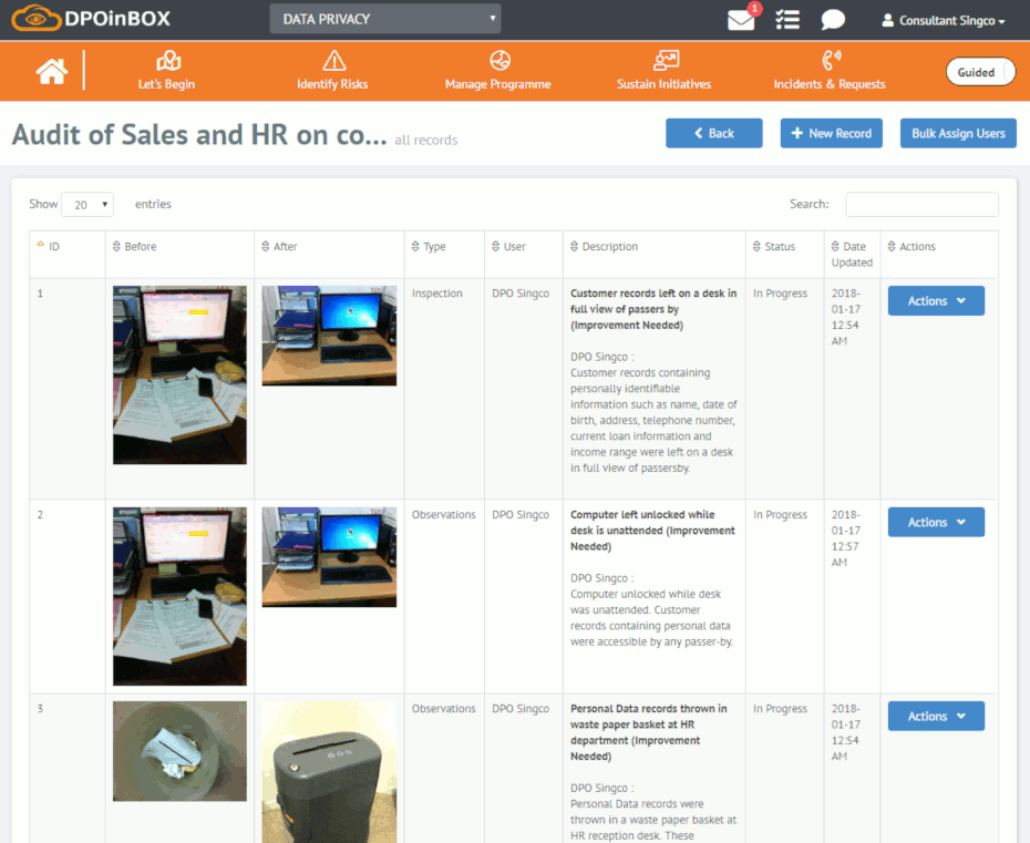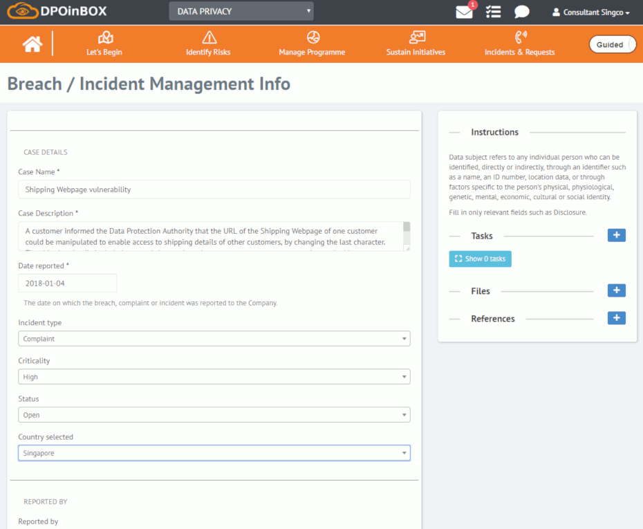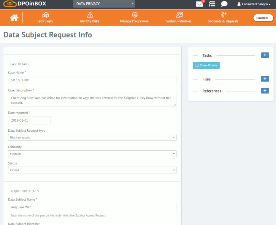 Document and manage incidents such as breaches and complaints. Handle data subject requests (assess or correction) that are required under data protection laws.
